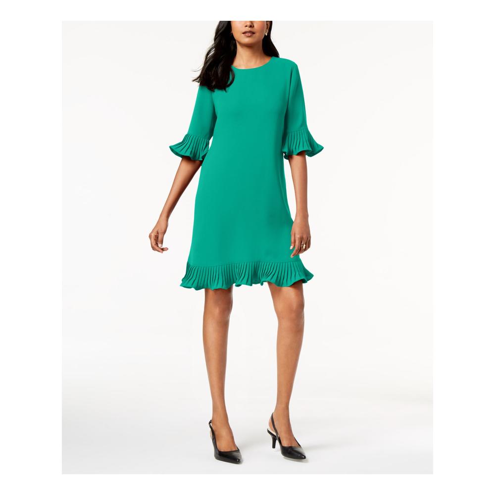 Alfani Alfani Womens Green Pleated Bell Sleeve Jewel Neck Short A Line Wear To Work Dress Size 14